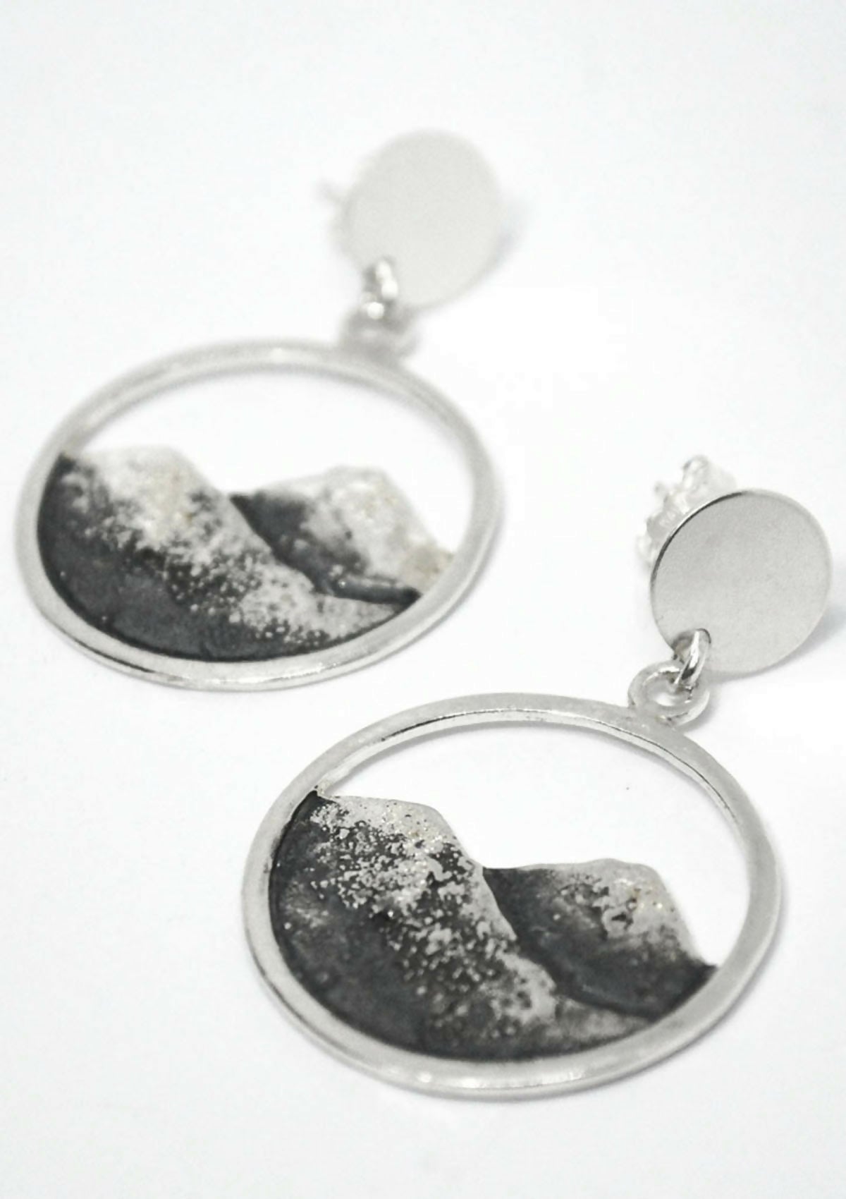 Unos aros para llevar un fragmento de la cordillera de los andes junto a ti. Hechos a mano, completamente en plata 950, con texturas logradas al fuego del soplete y aplicación de pátina negra en la base de las montañas.