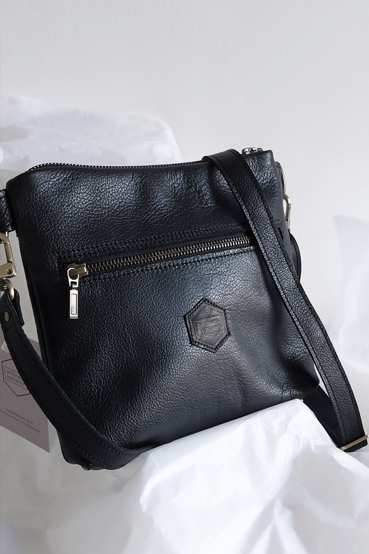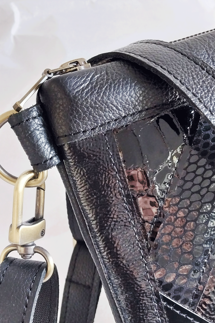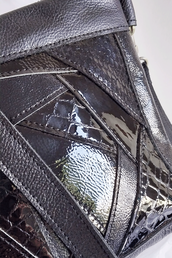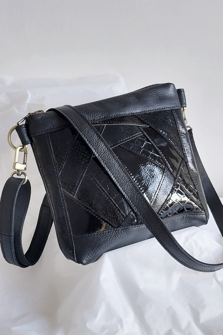 Fragmentos de remanentes de nuestra producción se unen para confeccionar una pieza única e irrepetible. Se cierra con cremallera YKK color bronce y tiene una correa de cuero de 2cm. de ancho y 1,4 mt. de largo, regulable y removible. En la parte posterior cuenta con un bolsillo exterior con cierre YKK. Está forrada y en el interior tiene un bolsillo con cierre.