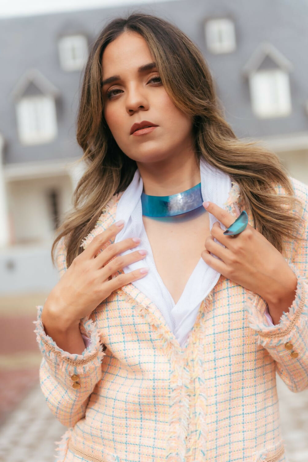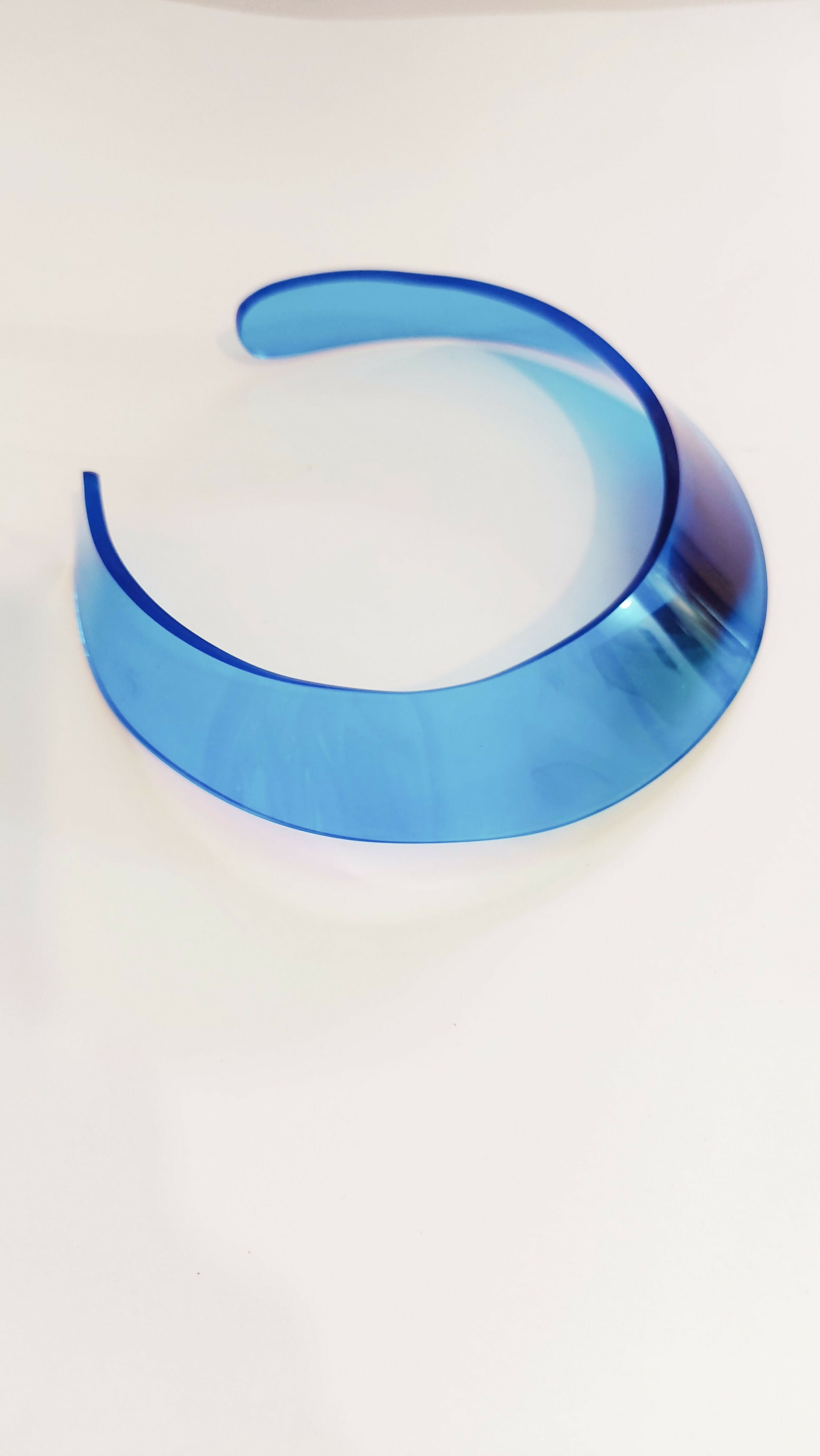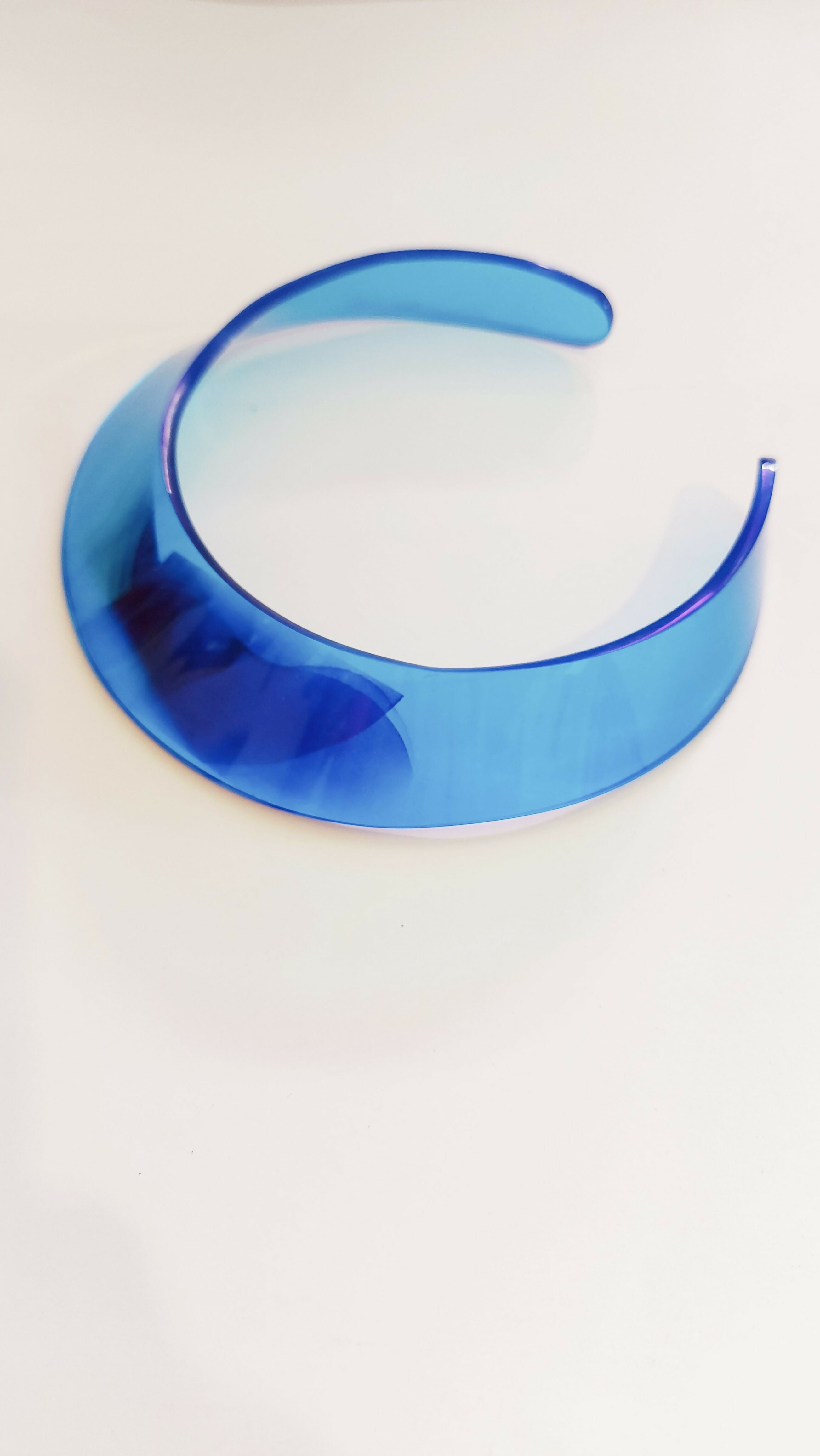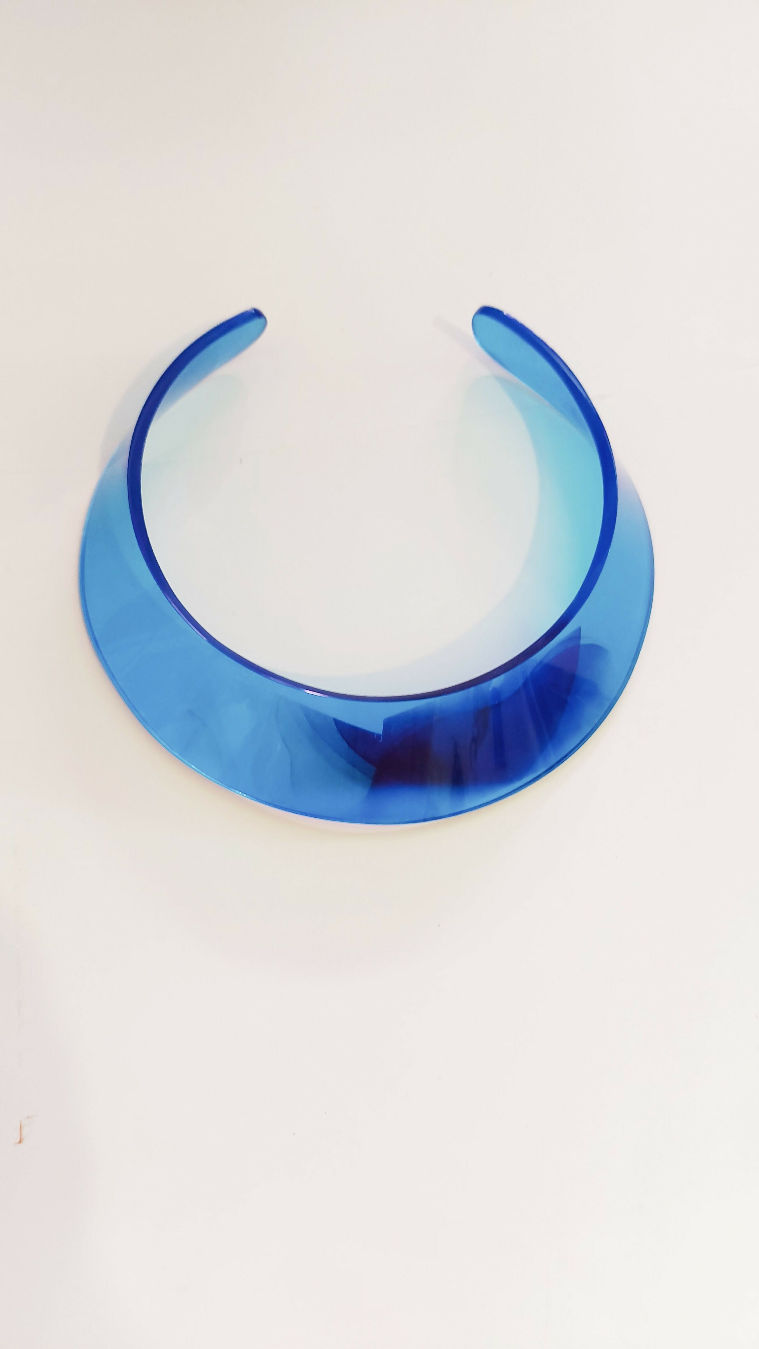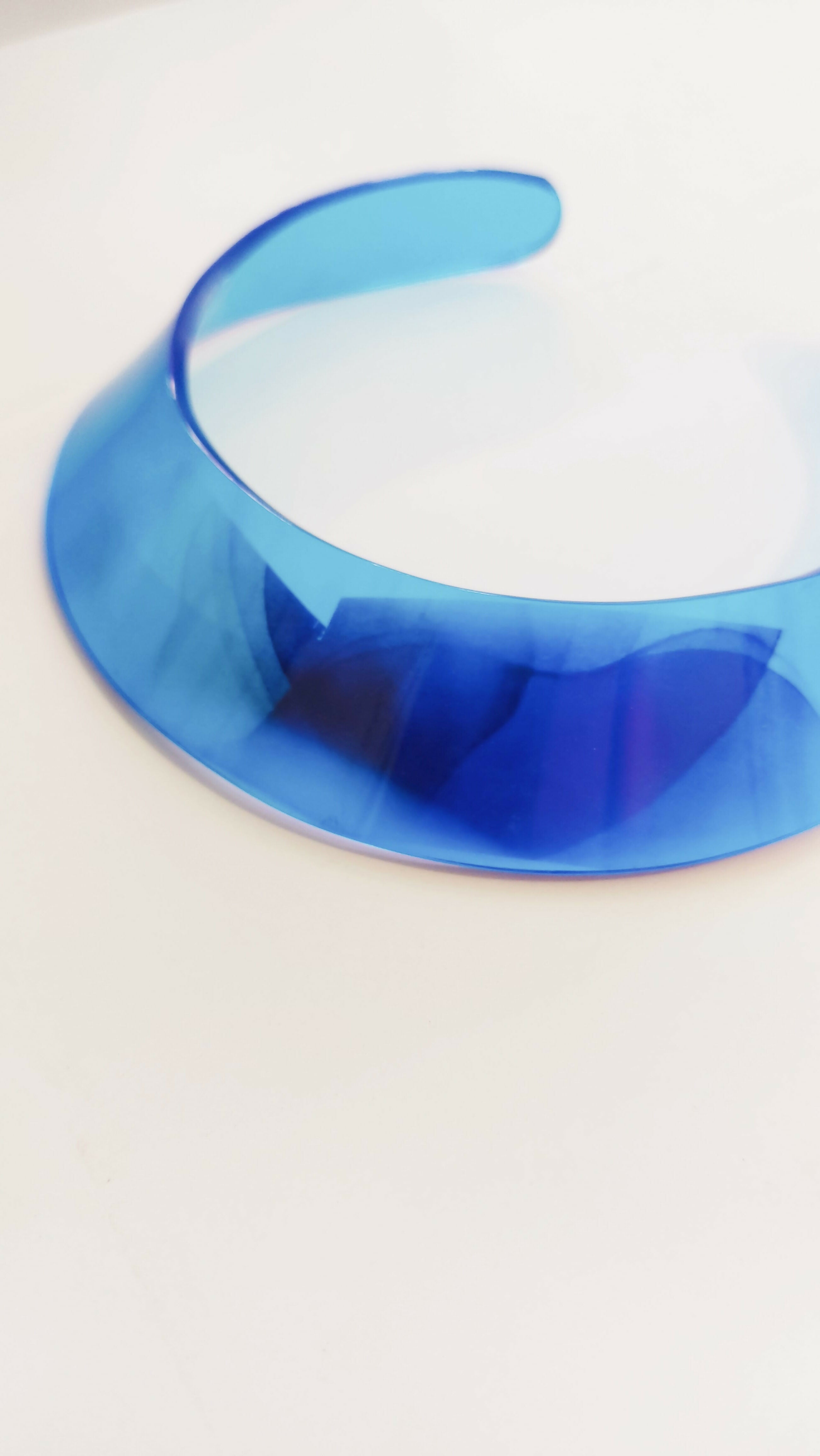 Collar apegado al cuello de acrílico de 3 mm, cian traslúcido con estampado azul, tamaño M. Fácil de poner, diseño minimalista y moderno. Contorno de cuello 85 cm.