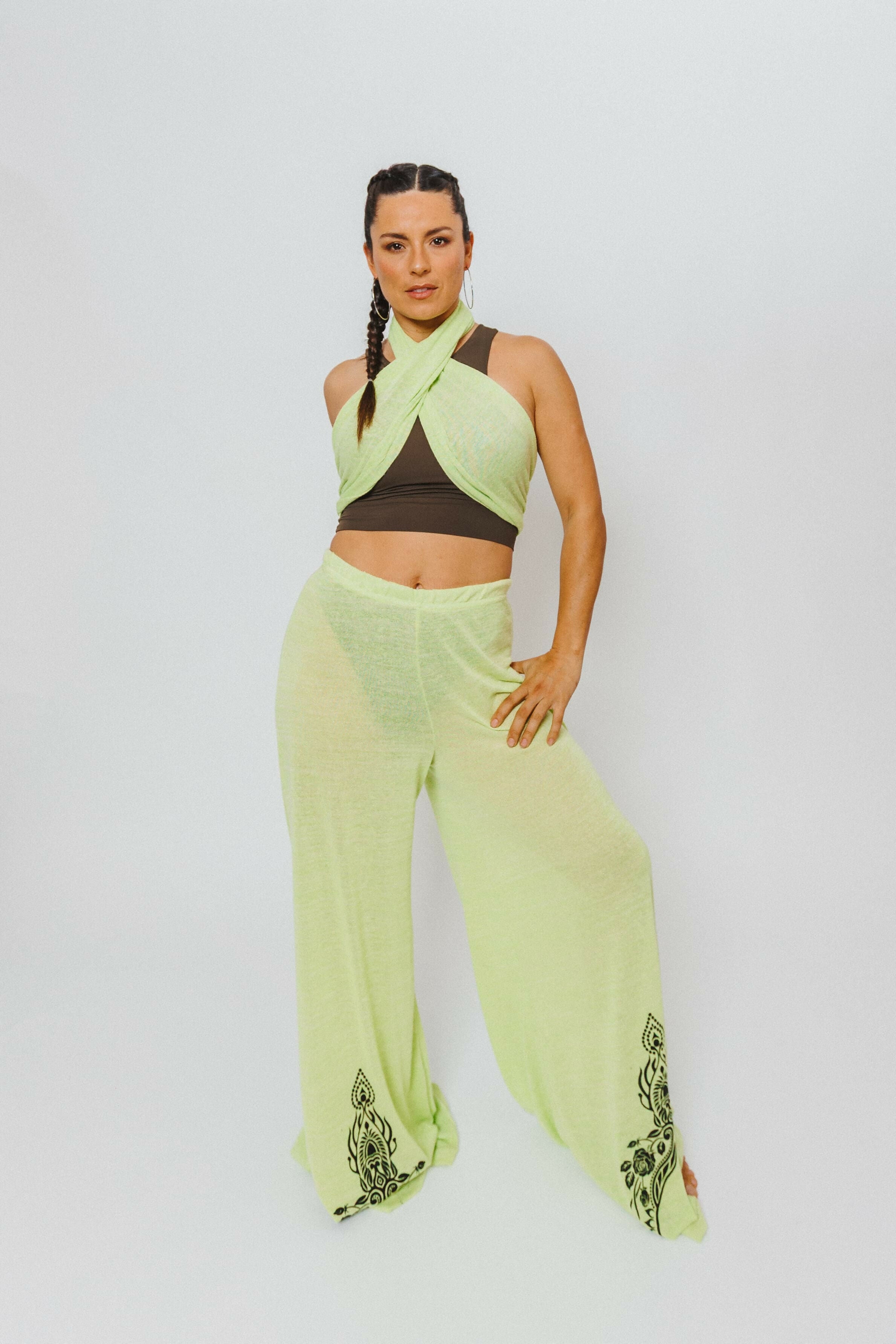 Pantalón SLAVIA LIMA Esta fabricado de tejido JERSEY de algodón nacional, estampada por nosotros en nuestro taller. Se trata de un tejido industrial de algodón suale y livianitoo, con cierta translucidez. Es ideal para este clima cálido usar con shorts o prenda más larga.
