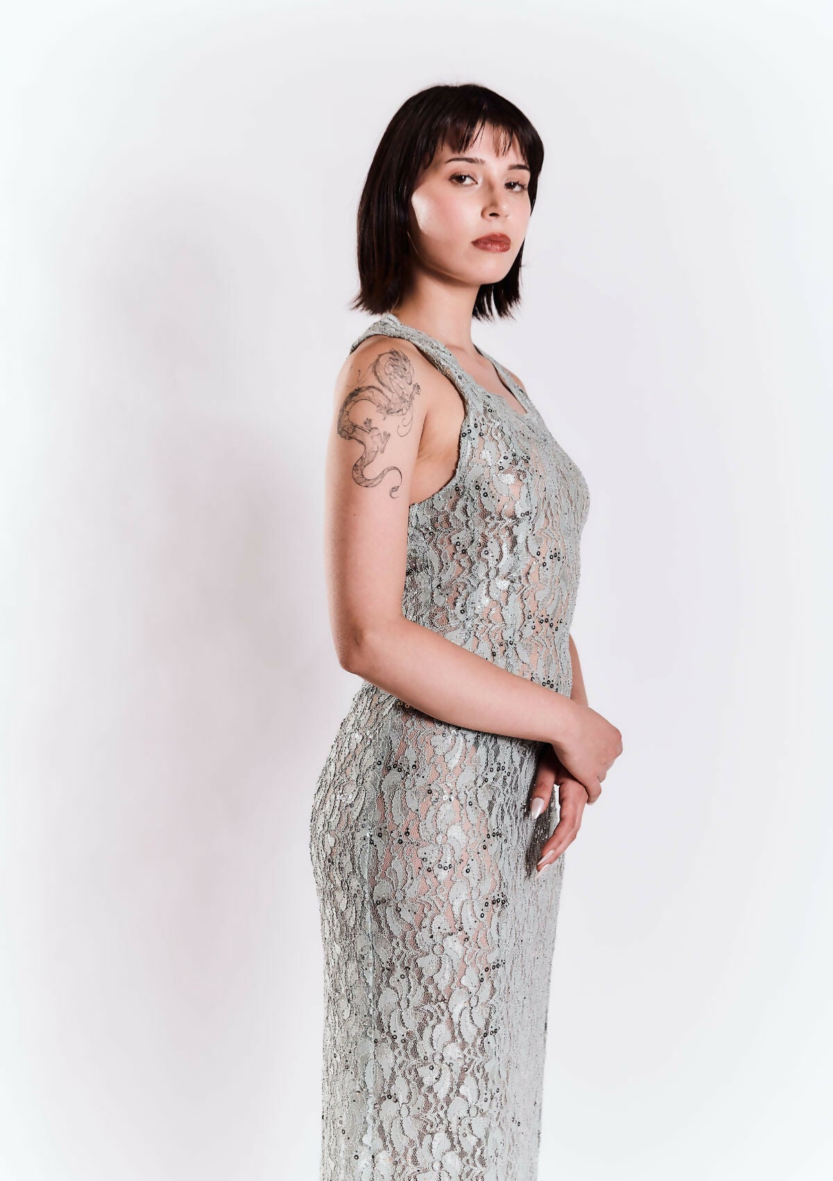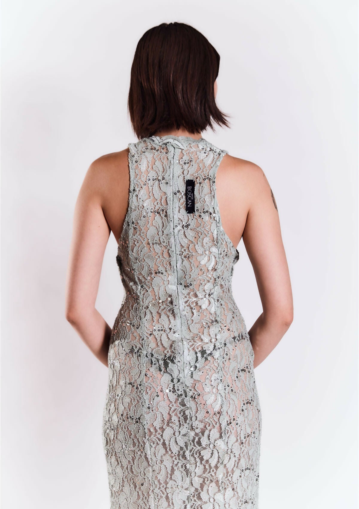 Su escote favorecedor resalta el cuello y los hombros, aportando un aire elegante y delicado. Confeccionado en suave encaje brillante cuidadosamente trabajado, cae con fluidez envolviendo la silueta con un movimiento sutil y sofisticado.