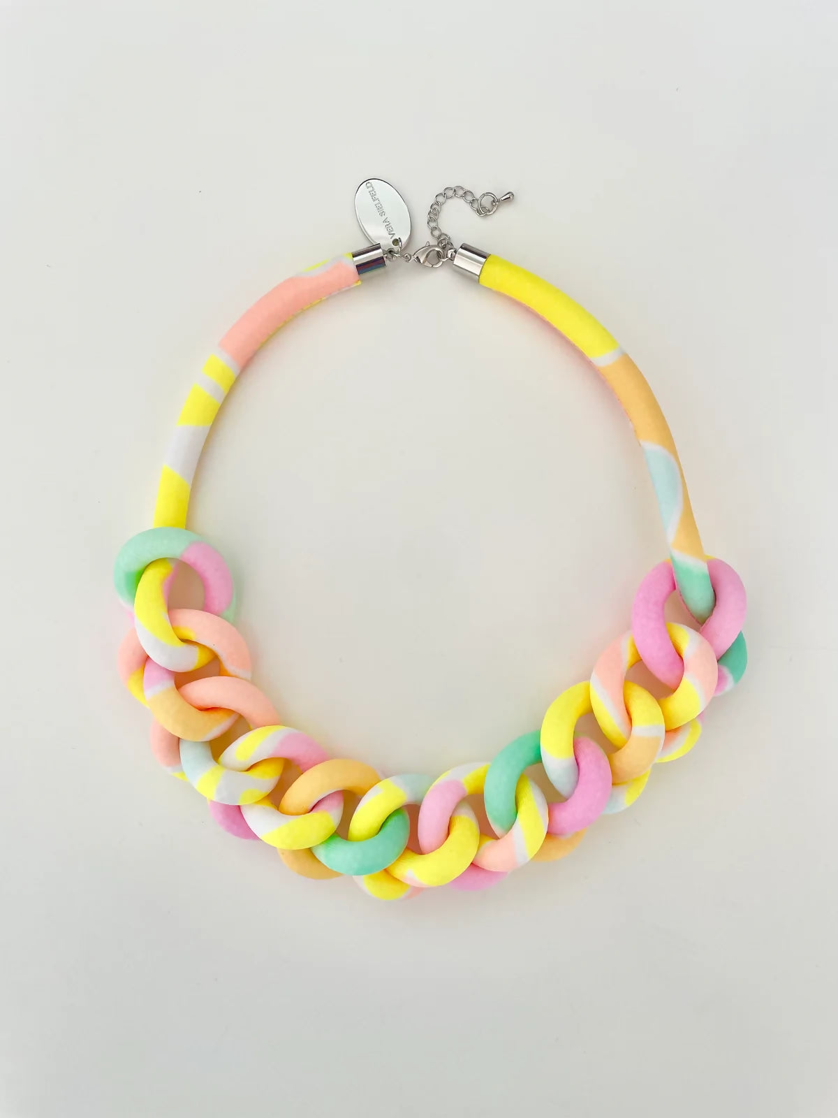 Lúcete con este collar cadena en mix de colores fluor vibrantes ideal para alegrar tu día a día. Debido al diseño del estampado de la tela, ningún collar es igual al otro y tiene pequeñas variaciones en cuanto a la distribución de los colores. Mejor así, tu collar siempre va a ser único! Piola de nylon y tela. Terminales, broche y cadenita de alargue (5 cm) metálicos, bañados en color platino, libre de níquel y cadmio. Incluye la distintiva medalla de la marca. Largo: 52 cm aprox. Cuidados: Limpiar con un paño húmedo y jabón neutro. No sumergir en agua.